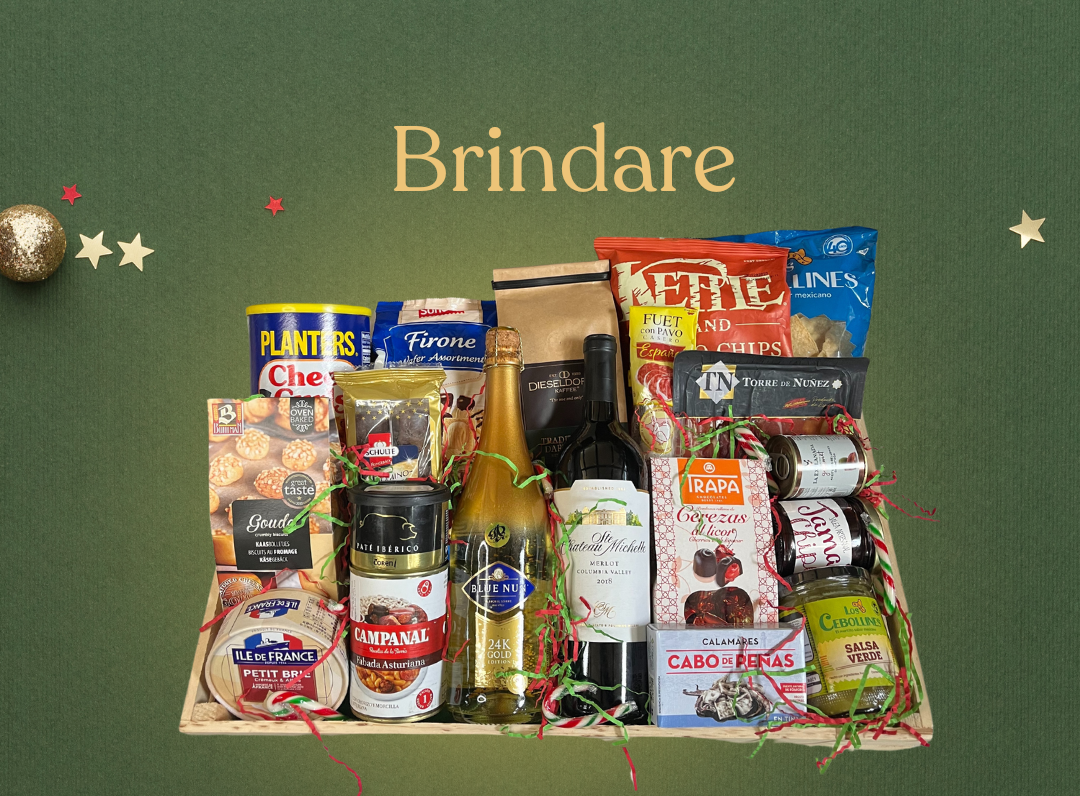 Botella de vino espumoso Blue Nun 24K Gold, Botella de vino Chatea Ste. Michelle, Queso Petit Brie Ile de France, Biscuits de queso Gouda, Planters Cheez Curls, Café Dieseldorff Kaffee, Mazapán cubierto de chocolate Schulte Domino-Steine, Galletas tipo wafer gourmet Firone, Papalinas Ketlle Chips, Caja de calamares en su tinta Cabo de Peñas, Salsa Verde Los Cebollines, Jamón Serrano Torre de Núñez, Fabada Asturiana Campanal, Paté Ibérico, Fuet de pavo, Cerezas cubiertas de chocolate Trapa, Frasco de mermelada artesanal jamaica chipotle Le Café, Aceitunas rellenas de anchoas, Nachos Los Cebollines, Bastoncillos de menta, Canasta decorativa de madera, Empaque