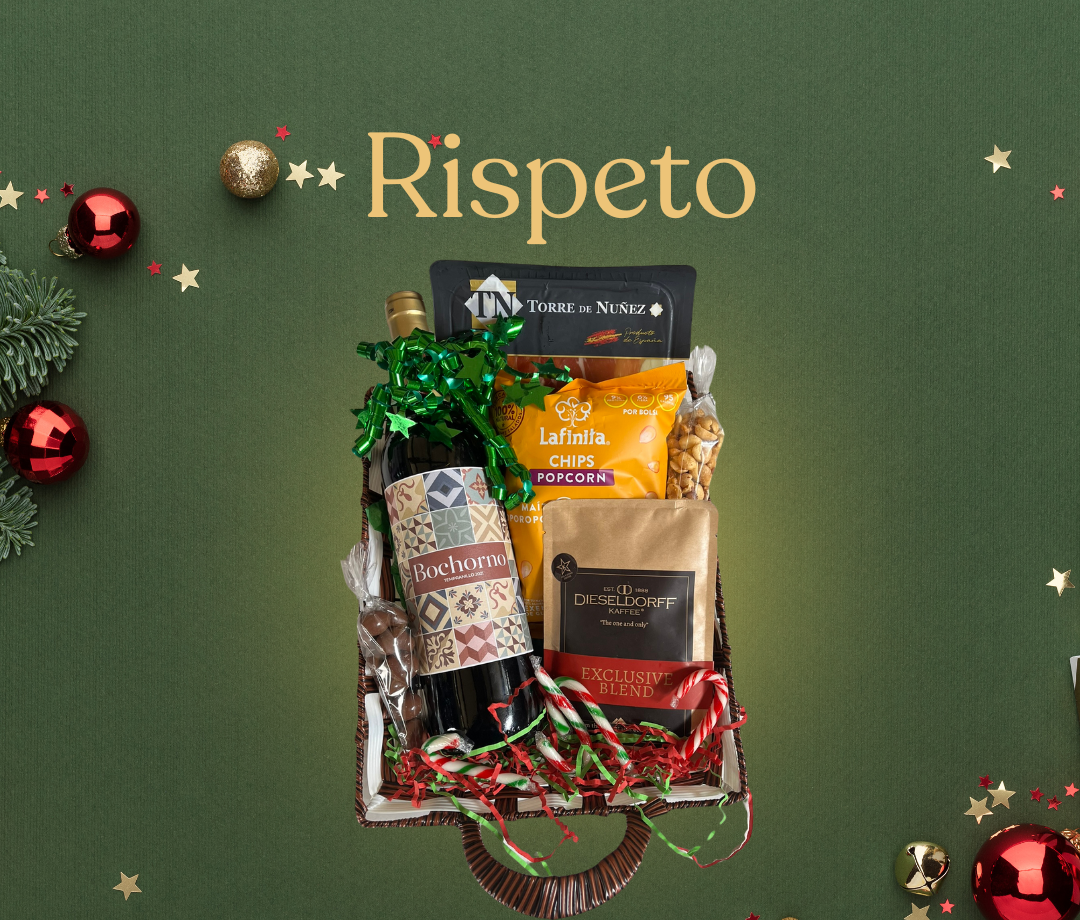 Botella de vino Bochorno, Jamón Serrano Torre de Núñez, Lafinita Chips Popcorn, Café Dieseldorff Kaffee, Cono de maní, Cono de almendras cubiertas de chocolate, Bastoncillos de menta, Canasta decorativa de mimbre, Empaque